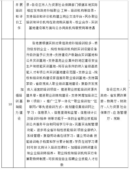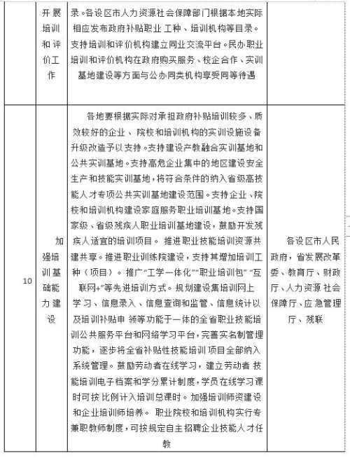 (十)加强培训基础能力建设。各地要根据实际对承担政府补贴培训较多、质效较好的企业、院校和培训机构的实训设施设备升级改造予以支持。支持建设产教融合实训基地和公共实训基地。支持高危企业集中的地区建设安全生产和技能实训基地,将符合条件的纳入省级高技能人才专项公共实训基地建设范围。支持企业、院校和培训机构建设家庭服务职业培训基地。支持国家级、省级残疾人职业培训基地建设,鼓励开发残疾人适宜的培训项目。推进职业技能培训资源共建共享。推进职业训练院建设,支持其增加培训工种(项目)。推广“工学一体化”“职业培训包”“互联网+”等先进培训方式。规划建设集培训网上学习、信息录入、信息查询和监管、信息统计以及培训补贴申领等功能于一体的全省职业技能培训公共服务平台和网络学习平台,完善实名制管理功能,逐步将全省补贴性技能培训项目全部纳入系统管理。鼓励劳动者在线学习,建立劳动者技能培训电子档案和学分累计制度,学员在线学习课时可按比例计入培训总课时。加强培训师资建设和企业培训师培养。职业院校和培训机构实行专兼 职教师制度,可按规定自主招聘企业技能人才任教。