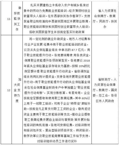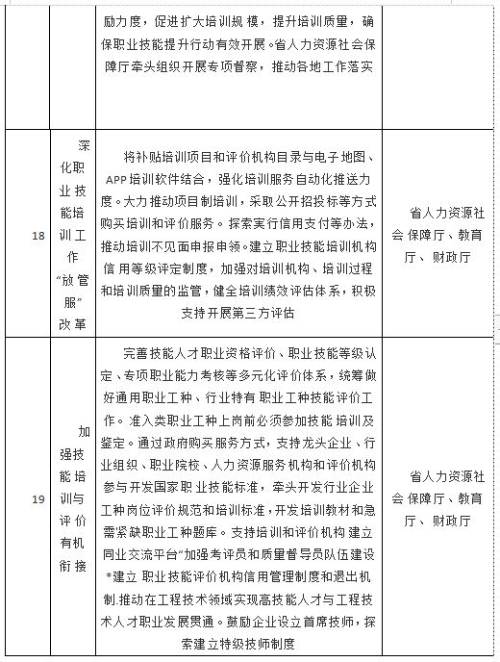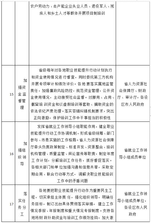 (十七)落实任务分工。各地要把职业技能提升行动作为重要民生工程,切实承担主体责任,强化组织领导,明确任务目标, 制定出台具体贯彻落实举措,建立工作情况季报、年报制度和重大情况专报制度。支持各地将财政补助资金与培训工作绩效挂钩,加大激励力度,促进扩大培训规模,提升培训质量,确保职业技能提升行动有效开展。省人力资源社会保障厅牵头组织开展专项督察,推动各地工作落实。