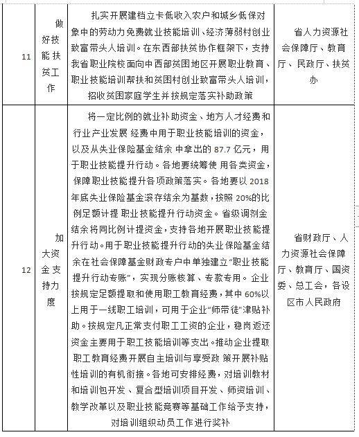 (十一)做好技能扶贫工作。扎实开展建档立卡低收入农户和城乡低保对象中的劳动力免费就业技能培训、经济薄弱村创致富带头人培训。在东西部扶贫协作框架下,支持我省职业院校面向中西部贫困地区开展职业教育、职业技能培训帮扶和贫困村创业致富带头人培训,招收贫困家庭学生并按规定落实补助政策。